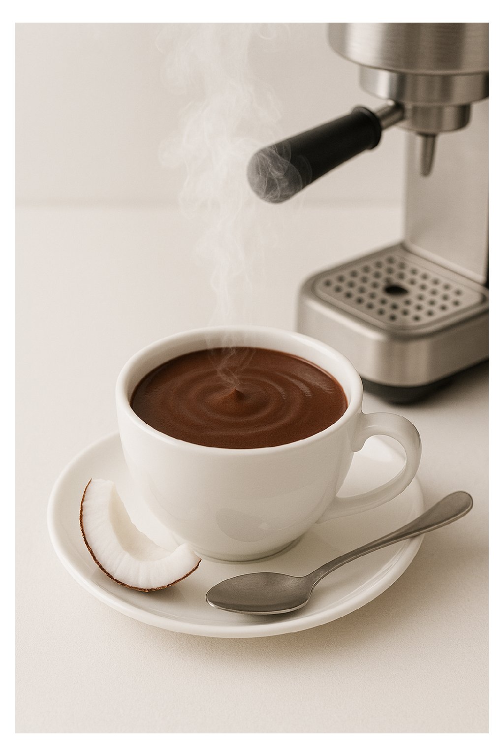 Exotická vlna v šálku – krémová čokoláda s kokosovým nádechem. Když se spojí kakaová hloubka s jemnou kokosovou vůní, vzniká nápoj, který zahřeje i potěší. Hot chocolate kokos je jako krátká dovolená – intenzivní, sametový a s tropickým akcentem. Krémová konzistence a hustota potěší každého milovníka poctivé čokolády. Bez barviv, bez konzervantů, s čistým složením a jednoduchou přípravou. Ať už ve vaší kavárně, nebo doma na gauči – tento šálek přenese chuťové buňky do teplejších krajů.